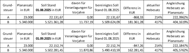 Die Darstellung zeigt, dass aufgrund der zum Teil weiterhin ausstehenden Erstveranlagungen und der im Verfahren befindlichen Einsprüche kontinuierlich mit Veränderungen zu rechnen ist. Zum 01.08.2025 wurde der Planansatz in Höhe von 5,363 Mio. EUR um insgesamt ca. 180,5 TEUR überstiegen. Per 01.09.2025 war eine Reduzierung dieser Mehrerträge auf 161,4 TEUR zu verzeichnen. Wie sich diese Werte bis zum Jahresende 2025 verändern werden, ist nicht absehbar.